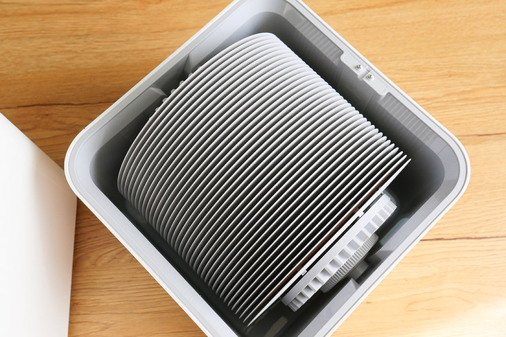 智米純凈型加濕器2內(nèi)部有36片蒸發(fā)片組成的蒸發(fā)盤,可形成近2㎡的超薄水膜,頂部貫流風扇強力送風,加快水膜蒸發(fā)。當蒸發(fā)盤需要清潔時,我們可以直接將蒸發(fā)盤取出,擦拭或水沖清理。