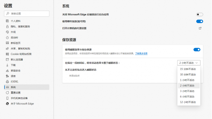 通過減少后臺、不活動的瀏覽器標簽頁所使用的系統(tǒng)資源(如RAM、CPU)來提高瀏覽器性能。用戶可以防止標簽頁網(wǎng)站進入睡眠狀態(tài),并配置不活動標簽頁進入睡眠狀態(tài)前的時間長度。這個功能也可以用組策略來管理。