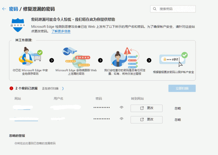 從 Microsoft Edge 88 開始,用戶密碼將被檢查與已知被破壞的憑證庫,如果發(fā)現(xiàn)匹配,將向用戶發(fā)送警報。