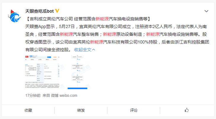 來自天眼查吃瓜bot的消息。根據(jù)天眼查App的顯示,5月27日,宜賓英倫汽車有限公司成立,注冊資本2億人民幣,法定代表人為南圣良,經(jīng)營范圍含新能源汽車整車銷售、新能源原動(dòng)設(shè)備制造、新能源汽車換電設(shè)施銷售等等。