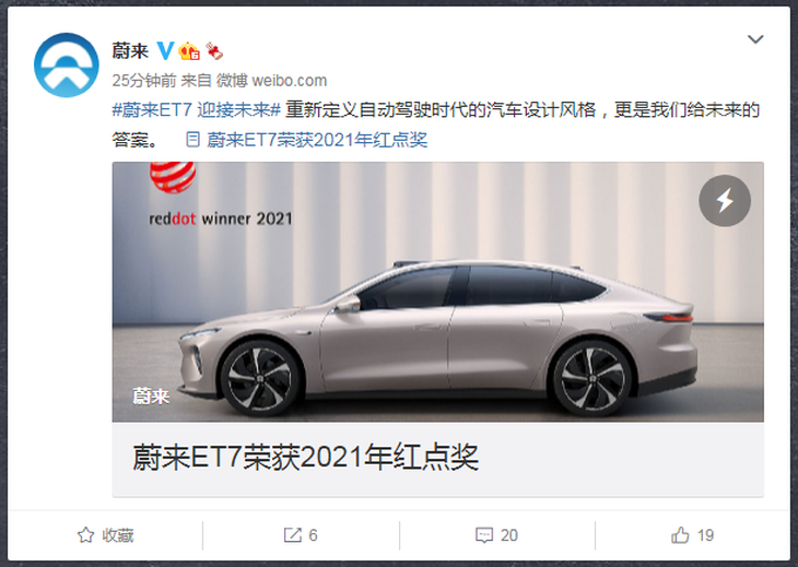 來自蔚來官微的新消息,蔚來ET7榮獲了2021年紅點(diǎn)獎。