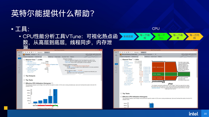在游戲優(yōu)化這里面,英特爾能夠提供什么幫助呢?我們說工欲善其事,必先利其器。英特爾這幾年的經驗有相當一部分的資源就是有一整套的性能分析工具。例如英特爾的Vtune分析工具,在行業(yè)里面名氣還是響當當?shù)?,無論還是服務器還是客戶端,它可以從系統(tǒng)層面一直到每一個線程,每一個DLL,每一個函數(shù),再到每一行代碼,再到匯編都可以給你整的清清楚楚,明明白白的。這也是經過了英特爾幾十年的沉淀,而且它是免費的。
