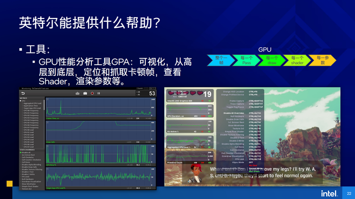 在GPU上,英特爾也有一個很好的工具GPA。在過去十來年我們和客戶合作過程當中,GPA工具也是廣受客戶贊譽的,它會對整個游戲總體的情況,具體到每一個 Pass,每一個 Draw call,每一個Shader,每一個參數(shù)都可以通過這個能夠發(fā)現(xiàn),你可以方便定位這些問題,然后讓開發(fā)者知道是什么情況。