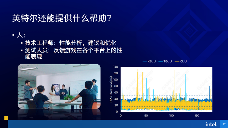 除了工具之外,人也是非常重要的。英特爾有一些技術工程師在游戲開發(fā)的早期就會進去。另外英特爾在發(fā)布一些新的平臺的時候,我們會在測試版的機器就會給到這些開發(fā)者,讓他們提前進行適配。