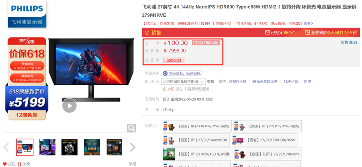 ? ? 目前,這款飛利浦279M1RVE電競顯示器正值京東618促銷熱賣中,現(xiàn)在預(yù)定可享受100元定金抵2900元的超值優(yōu)惠,并且保價至6月18日。付定金,優(yōu)先發(fā)貨,最終到手價僅5199!>>購買鏈接