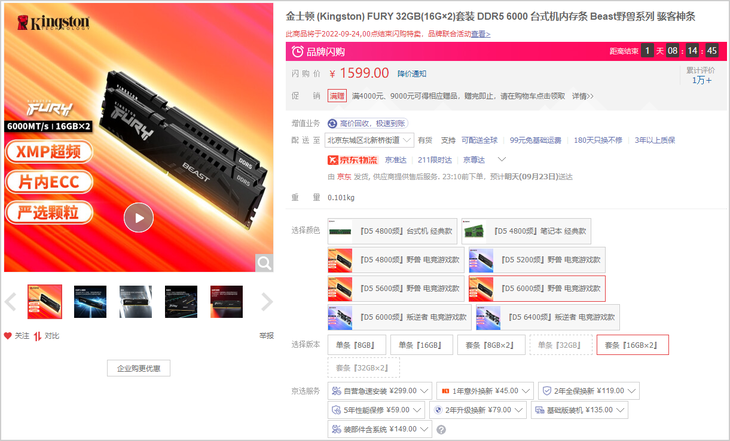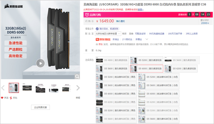 目前京東商城上,一套一線大牌的DDR5-6000MHz 2×16GB套裝,大概在1599元左右。