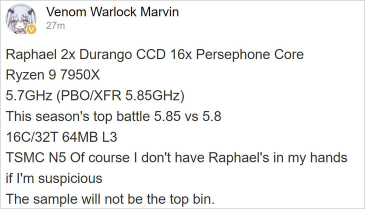 有網(wǎng)友曝光了AMD銳龍9 7950X處理器的加速頻率,不開PBO可達(dá)5.7GHz,開啟PBO可達(dá)5.85GHz。