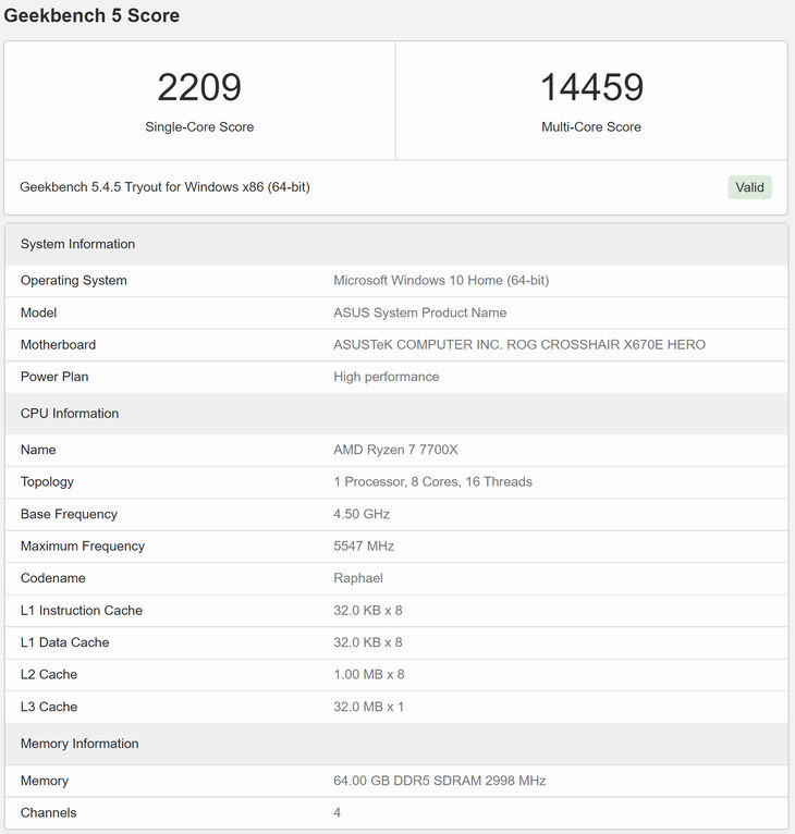 以銳龍7 7700X這款8核心16線程處理器為例。在Geekbench 5.4.5版本中,銳龍7 7700X的單核心成績?yōu)?209分,多核心成績?yōu)?4459。該測試采用的是一塊華碩X670E芯片組主板,操作系統(tǒng)為Win10。