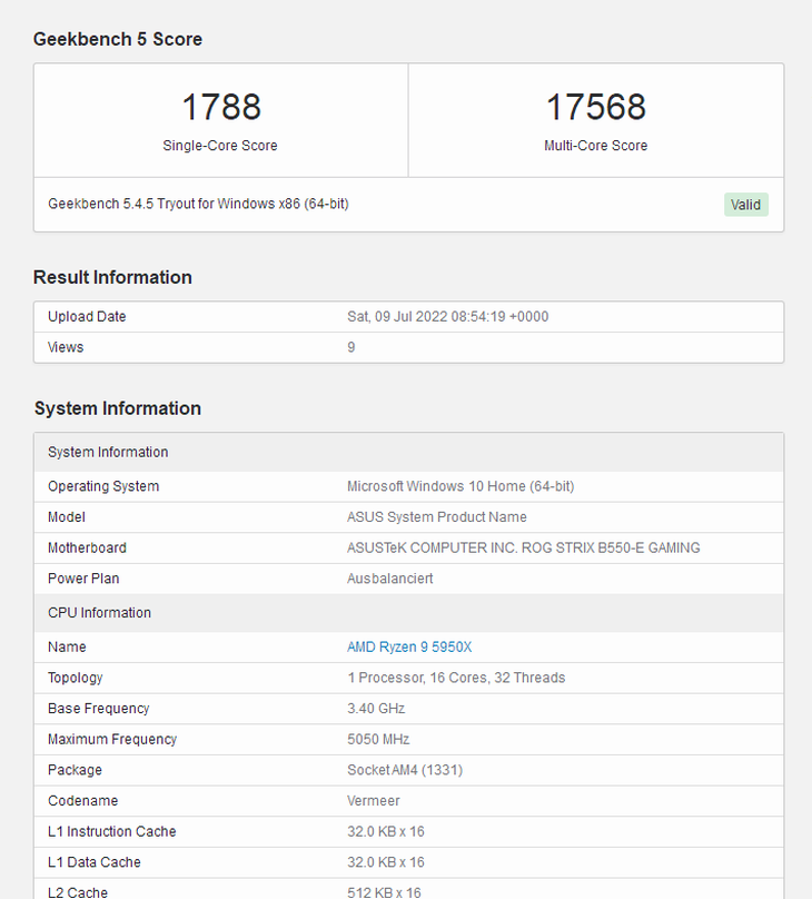 現(xiàn)役AMD旗艦處理器銳龍9 5950X在Geekbench 5.4.5版本中的單核心成績?yōu)?788分,多核心成績?yōu)?7568分。