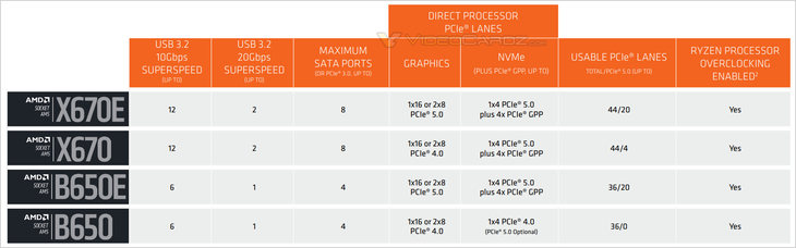 這一代BX50芯片組主板提供了B650和B650E兩款芯片組主板。從規(guī)格參數(shù)來看,B650和B650E芯片組主板最大的區(qū)別在于,B650芯片組主板僅支持到PCIe4.0,不支持PCIe5.0,而B650E芯片組主板支持PCIe5.0。