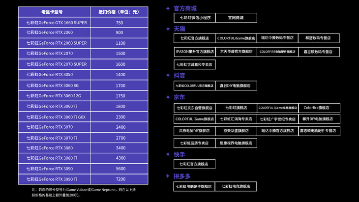 本次參與以舊換新的七彩虹老型號顯卡包含部分GTX 16系列、RTX 20系列以及RTX 30系列,值得注意的是若您手中的老型號顯卡為iGame Vulcan或者iGame Neptune,則會在下圖表格中額外疊加200元。