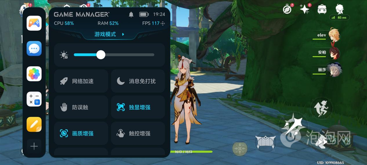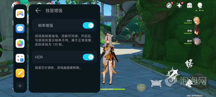 在游戲過程中,我們可以通過側(cè)滑的方式開啟GAME MANAGER,在軟件中可以開啟獨顯增強以及畫質(zhì)增強功能,獨顯增強包含幀率增強以及HDR模式,開啟幀率增強后可以通過插幀的方式來提升游戲畫面的流暢度。