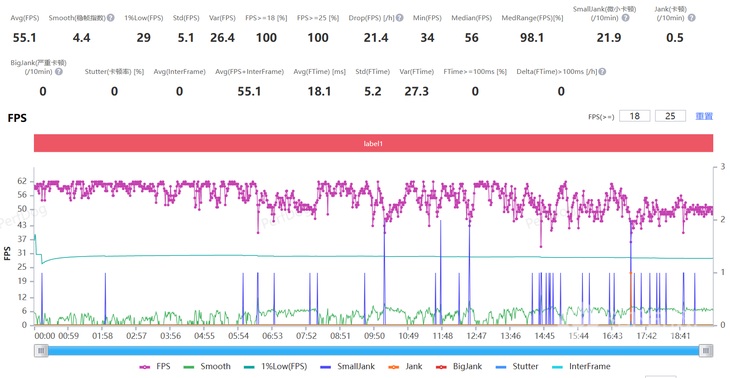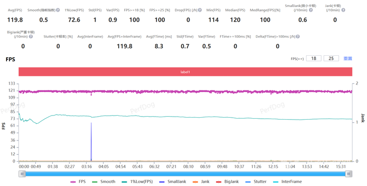 經(jīng)過實測,《王者榮耀》在選擇極高幀率 、超高分辨率以及高清畫質(zhì),經(jīng)過Perfdog測試,最終平均幀率達到了 119 .8FPS,游戲過程非常流暢,沒有卡頓的情況。