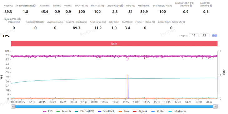 《和平精英》選擇高清畫質(zhì),可以開啟90幀模式,經(jīng)過Perfdog測試平均幀率為89.3FPS,幀率曲線也是十分的平穩(wěn)。