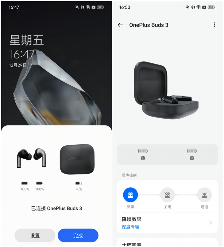 一加 Buds 3配合一加手機(jī)可以實(shí)現(xiàn)開蓋閃聯(lián)的體驗(yàn),配對更加方便。在配對之后,每次連接耳機(jī)都會在手機(jī)上進(jìn)行彈窗,顯示耳機(jī)以及充電盒的電量信息。