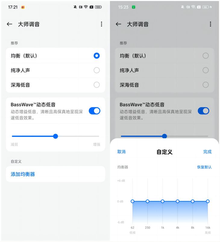 一加 Buds 3還支持大師調(diào)音功能,內(nèi)置均衡、純凈人聲以及深海低音三種模式,不同的模式在音樂呈現(xiàn)風(fēng)格上有所不同,用戶還可以根據(jù)自己的進(jìn)行均衡器的自定義設(shè)置。