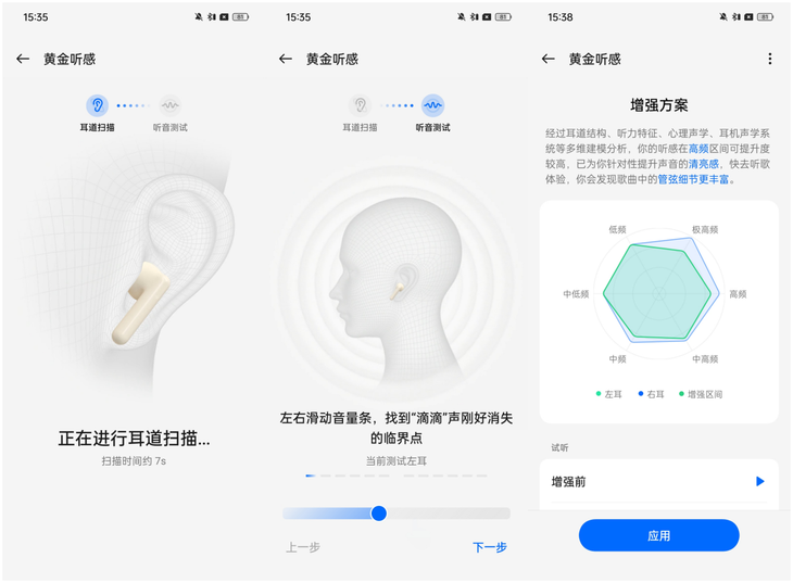 一加 Buds 3支持黃金聽感2.0,通過泄露補(bǔ)償、耳道補(bǔ)償、個性化聽感三大技術(shù),實(shí)現(xiàn)個人聲音的定制,整個過程操作簡單,可以輕松定制適合自己的聲音。