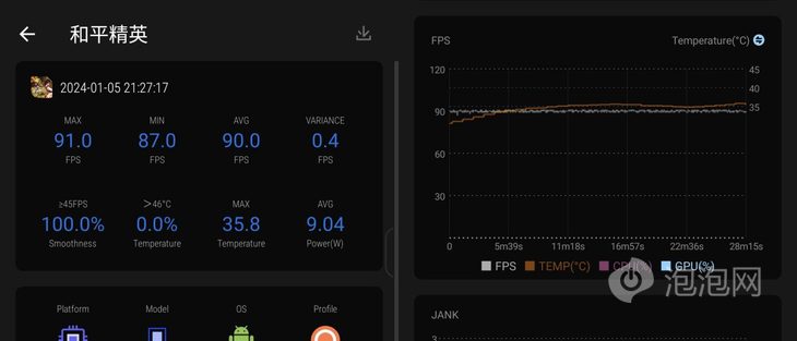 在安裝好散熱器并開啟酷寒模式后,開啟《和平精英》高清 + 90 幀,ROG 8 Pro 不出意外輕松拿捏,平均到 90fps,最 低幀高達(dá) 87!