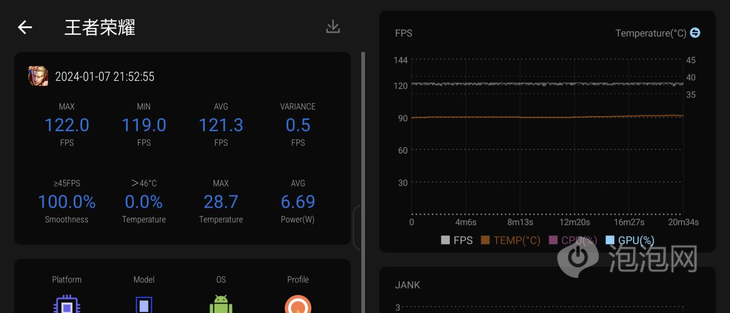 至于《王者榮耀》那就更沒壓力了,酷寒模式下開啟最 高特效,最 低幀 119,平均 121.3FPS。