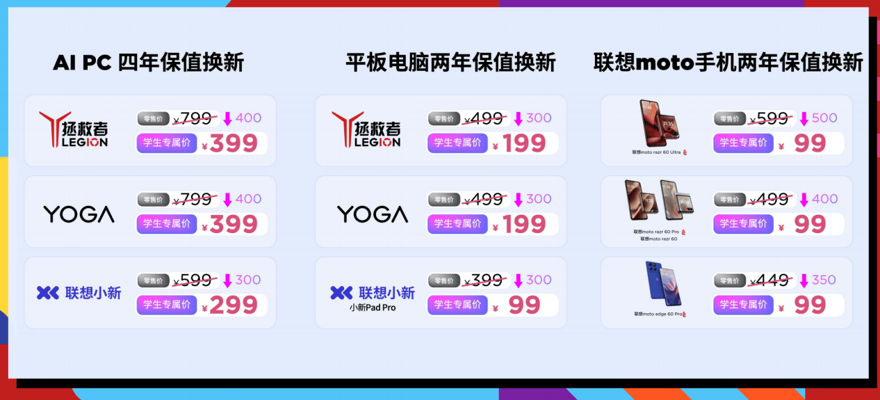 除了單品低至9折的超值優(yōu)惠,聯(lián)想還為“脆皮”大學(xué)生們推出了專屬的保值換新優(yōu)惠政策,為大學(xué)生們的設(shè)備保駕護(hù)航。購買此項(xiàng)服務(wù),立享300-500優(yōu)惠。比如購買AI PC享受2年保值6折、4年保值5折;購買平板電腦享受1年保值6折、2年保值5折;購買聯(lián)想moto手機(jī)則享受1年保值6 折、2年保值5折的超值福利,大學(xué)生們再無需擔(dān)憂設(shè)備貶值,隨用隨換新。