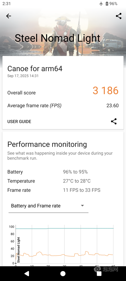 在GPU方面我們還使用了3DMark進(jìn)行測(cè)試,選擇項(xiàng)目為Steel Nomad Light,最終的總成績(jī)?yōu)?186分,