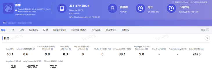PerfDog測(cè)試顯示,游戲平均幀率為60.1FPS,平均功耗為4.37W。