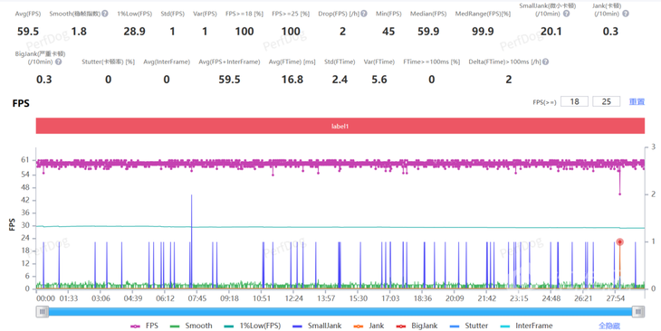 PerfDog測(cè)試顯示,游戲平均幀率為59.5FPS,平均功耗為3.96W。