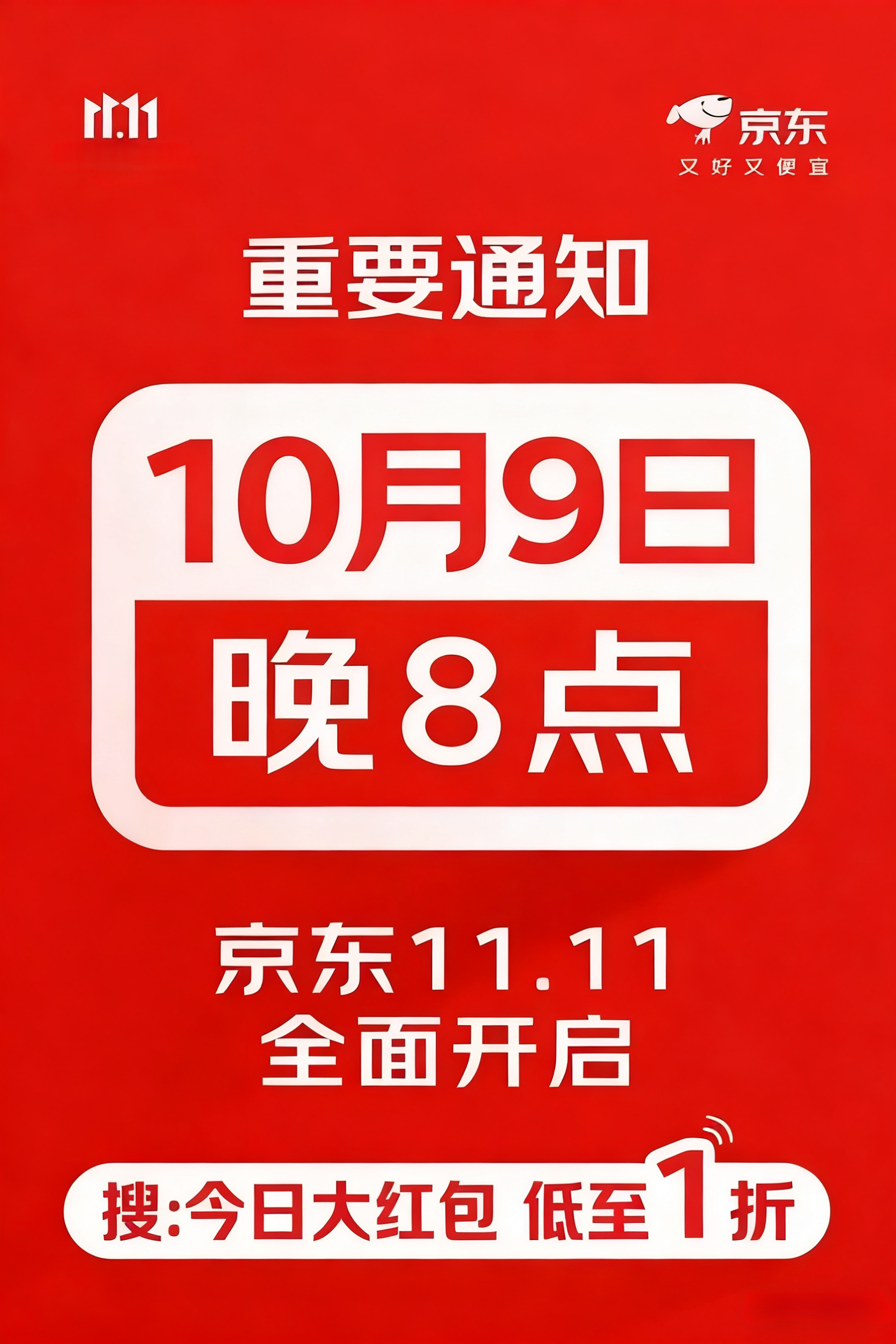 從10月9日至11月11日,消費(fèi)者可通過(guò)京東APP搜索口令“今日大紅包”,每日領(lǐng)取京東雙11京享紅包。