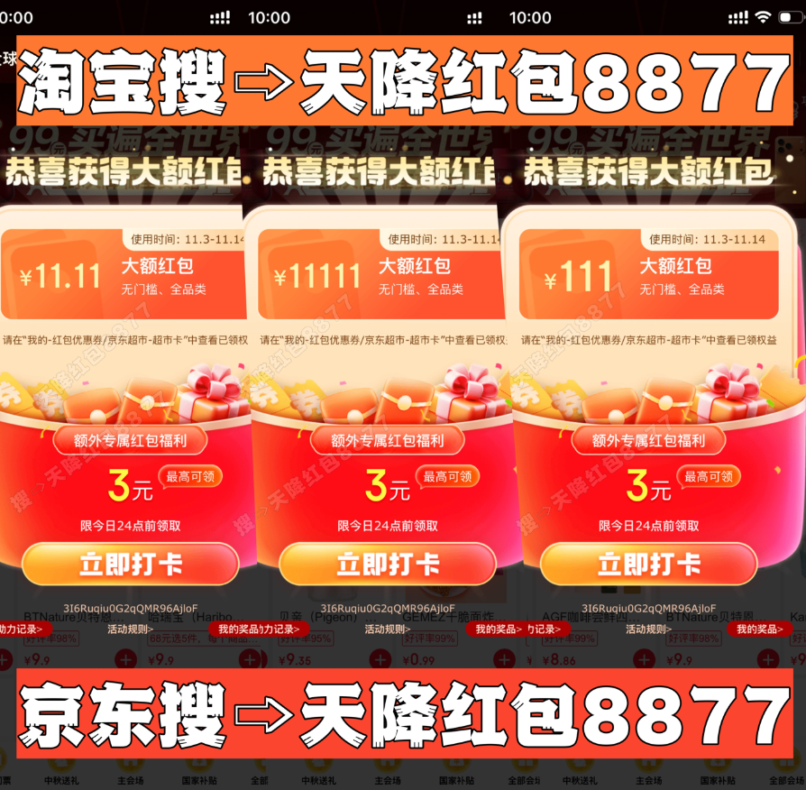 劃重點!今年天貓/淘寶和京東最新的雙十一統一紅包口令都是「天降紅包8877」一定要記??!領的紅包大小和你搜索的什么口令有關的!“天降紅包8877”這個雙平臺唯一紅包口令包領到大的!記得每天去領!