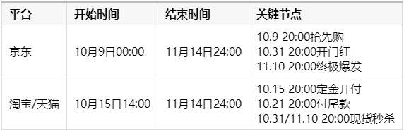京東從10月9日開(kāi)搶,淘寶/天貓從10月15日啟動(dòng),統(tǒng)一11月14日結(jié)束,整整37天超長(zhǎng)狂歡!