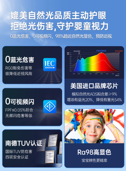 此外,該燈具更是實(shí)現(xiàn)了零藍(lán)光危害(達(dá)到RG0豁免級)與無可視頻閃(FPF=0.05%,符合無頻閃危害標(biāo)準(zhǔn)),從根源上降低近視風(fēng)險(xiǎn)。同時(shí),燈具具備Ra98的高顯色指數(shù),能精準(zhǔn)還原色彩,助力嬰幼兒的辨色能力發(fā)展。