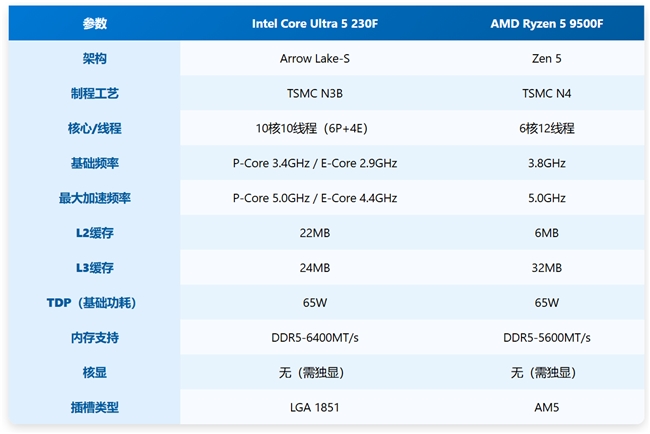 AMD銳龍5 9500F與英特爾酷睿Ultra 5 230F是當(dāng)下1000元檔位具有代表性的CPU之一,同時(shí)也體現(xiàn)了英特爾與AMD兩家設(shè)計(jì)上的方向。