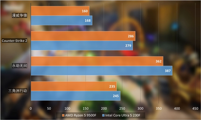 在《Counter-Strike 2》中,銳龍5 9500F則是扳回一局,比酷睿Ultra 5 230F表現(xiàn)好大概3%。