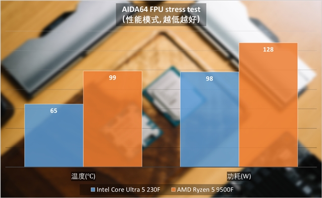 這里我們對兩塊處理器均接上360水冷,利用AIDA64 FPU壓力測試對酷睿Ultra 5 230F與銳龍5 9500F施加壓力??犷ltra 5 230F的CPU封裝功耗為98W左右,核心溫度65℃左右。同樣的條件下,銳龍5 9500F則有128W,核心溫度99℃,已經(jīng)開始撞到溫度墻。