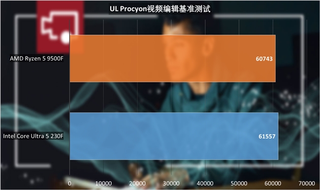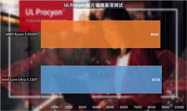 UL Procyon圖片編輯基準(zhǔn)測試中,酷睿Ultra 5 230F表現(xiàn)要比銳龍5 9500F也要強(qiáng)1%左右。