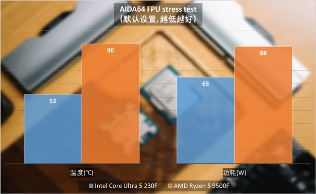 值得關(guān)注的是,如果僅以默認(rèn)模式運(yùn)行,例如酷睿Ultra 5 230F與銳龍5 9500F60W使用默認(rèn)的功耗,兩款處理器功耗分別為65W和88W,溫度52℃和90℃。