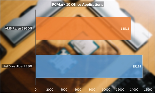 PCMark 10 Office Application測試的是Word、Excel、PowerPoint以及瀏覽器連續(xù)打開、編輯、多任務(wù)切換工作,比較考驗(yàn)單核burst性能和多線程并行效率表現(xiàn),這里酷睿Ultra 5 230F優(yōu)勢較為明顯,相對銳龍5 9500F有超過10%的性能表現(xiàn)。