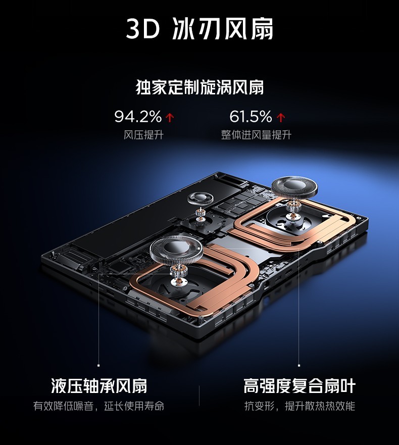 此外全新的3D冰刃風扇采用了2+1風扇布局,在獨家定制旋渦風扇與高強度復合扇葉的組合加持下,整體風量提升了61.5%,風壓提升了94.2%,能快速將散熱鰭片上的熱量排出機身,避免熱量堆積。