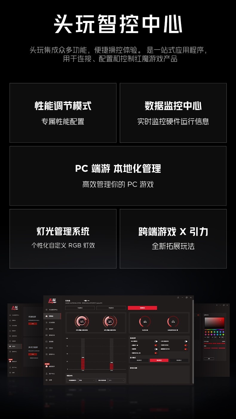 軟件服務也是紅魔游戲本的一大亮點,作為全球領先的電競裝備品牌,紅魔通過定制化軟件深挖硬件潛力,提升性能體驗。全新的專屬系統(tǒng)頭玩智控中心,支持多模式切換、手游投屏、端游串流等定制優(yōu)化。