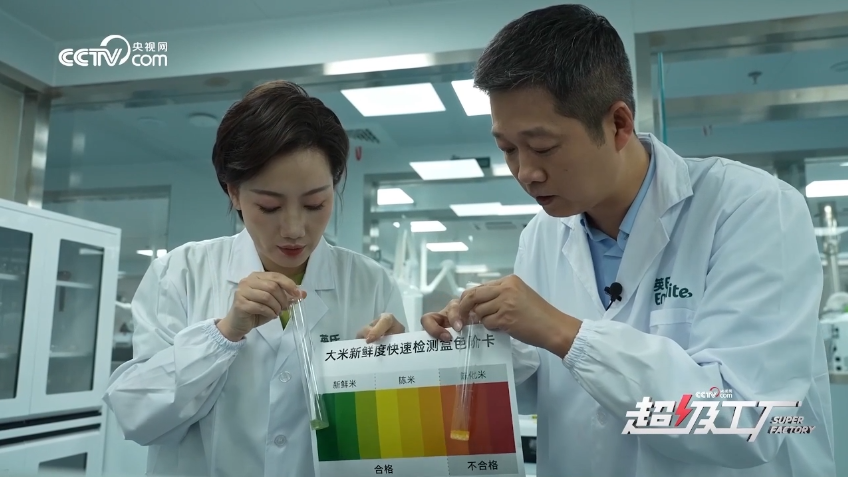 “英氏米粉的大米原料從帶殼稻谷到制成米片中間不超過 40 天”。在英氏質(zhì)量檢測(cè)實(shí)驗(yàn)室內(nèi),質(zhì)量管理部部長(zhǎng)趙濤向魏老爸與央視主持人常婷展示了英氏對(duì)米粉原料新鮮度的高度追求。為驗(yàn)證這一承諾,三人共同完成了一場(chǎng)直觀的大米新鮮度顯色實(shí)驗(yàn)。