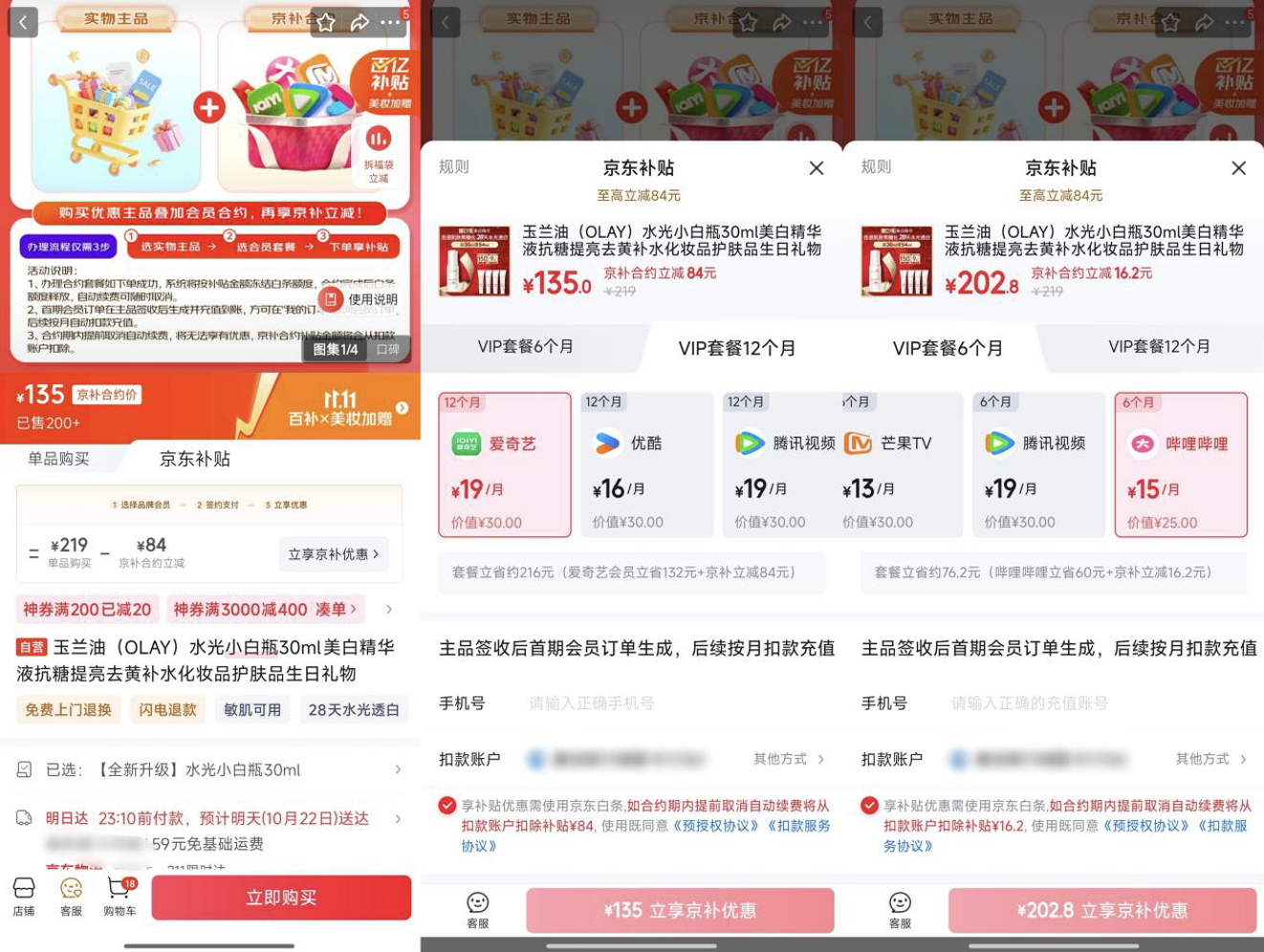 玉蘭油水光小白瓶30ml,京東原價(jià)239元,享滿200減20券,可辦理6/12個(gè)月優(yōu)酷/愛奇藝/騰訊視頻/嗶哩嗶哩會(huì)員/芒果TV會(huì)員。其中,辦理12個(gè)月愛奇藝會(huì)員,玉蘭油水光小白瓶享追劇補(bǔ)貼立減84元,到手價(jià)135元,同時(shí)原價(jià)每月30元的愛奇藝會(huì)員,在合約期間每月僅需19元,套餐合計(jì)立省216元;辦理6個(gè)月嗶哩嗶哩大會(huì)員,玉蘭油水光小白瓶享追劇補(bǔ)貼立減16.2元,到手價(jià)202.8元,同時(shí)原價(jià)每月25元的嗶哩嗶哩大會(huì)員,在合約期間每月僅需15元,套餐合計(jì)立省76.2元。