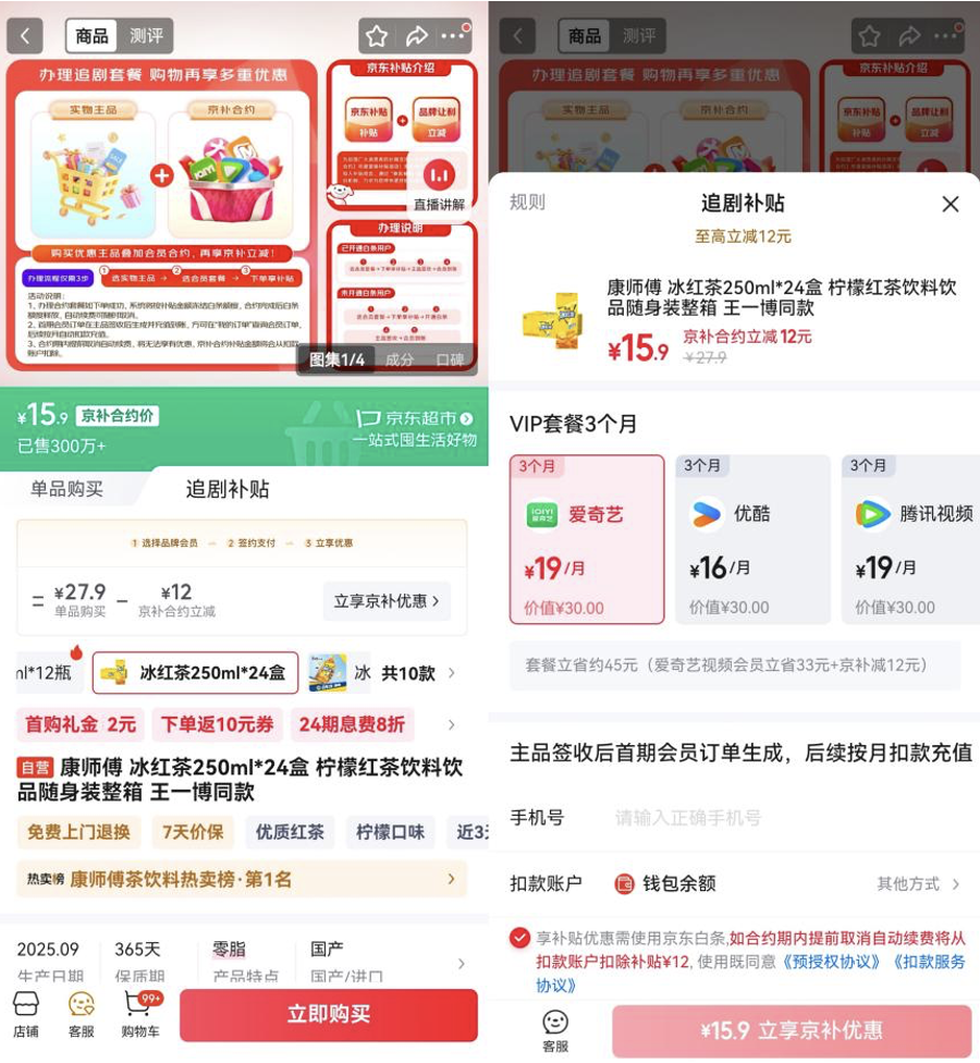 康師傅冰紅茶250ml*24盒,原價(jià)29.9元,享首購禮金2元,可辦理3個(gè)月優(yōu)酷/愛奇藝/騰訊視頻/嗶哩嗶哩會(huì)員/芒果TV會(huì)員。其中,辦理3個(gè)月愛奇藝會(huì)員,康師傅冰紅茶享追劇補(bǔ)貼立減12元,到手價(jià)15.9元,同時(shí)原價(jià)每月30元的愛奇藝會(huì)員,在合約期間每月僅需19元,套餐合計(jì)立省45元。