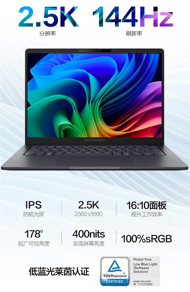 辦公體驗(yàn)不僅關(guān)乎效率,也關(guān)乎健康。該款華碩破曉6S 幻金版配備了14英寸2.5K分辨率的IPS高刷護(hù)眼屏。144Hz的高刷新率使得滾動(dòng)網(wǎng)頁(yè)、切換任務(wù)絲滑流暢。100% sRGB高色域與400nits的高亮度,確保了色彩真實(shí)飽滿(mǎn),即便在光線強(qiáng)烈的窗邊也能清晰顯示內(nèi)容。84%的高屏占比提供更廣闊的視野,而硬件級(jí)低藍(lán)光技術(shù)則能有效減少長(zhǎng)時(shí)間注視屏幕帶來(lái)的眼部疲勞,呵護(hù)用戶(hù)的視覺(jué)健康。