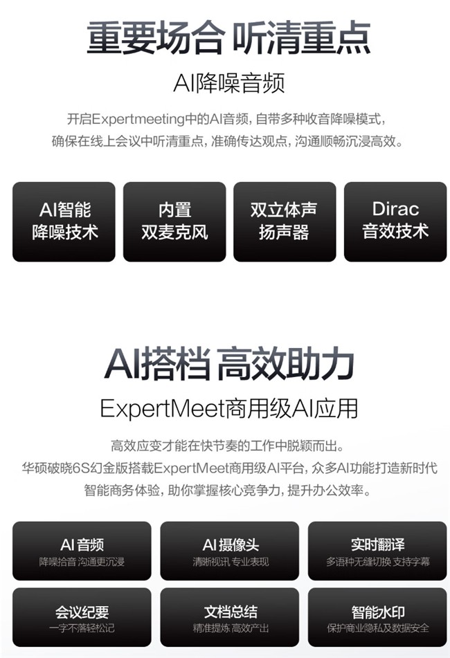 在遠(yuǎn)程協(xié)作常態(tài)化的今天,破曉6S幻金版內(nèi)置的ExpertMeet AI會(huì)議助手成為了得力幫手。它支持AI降噪拾音,確保在嘈雜環(huán)境中通話聲音依然清晰;高清攝像頭與智能視訊優(yōu)化,讓畫(huà)面始終保持非常好的狀態(tài);實(shí)時(shí)翻譯、會(huì)議記錄與文檔摘要功能,則能顯著提升跨國(guó)會(huì)議與內(nèi)部討論的效率,讓溝通無(wú)障礙,決策更迅速。配合Wi-Fi 7與藍(lán)牙5.3,無(wú)線連接更快更穩(wěn),保障信息流暢同步。