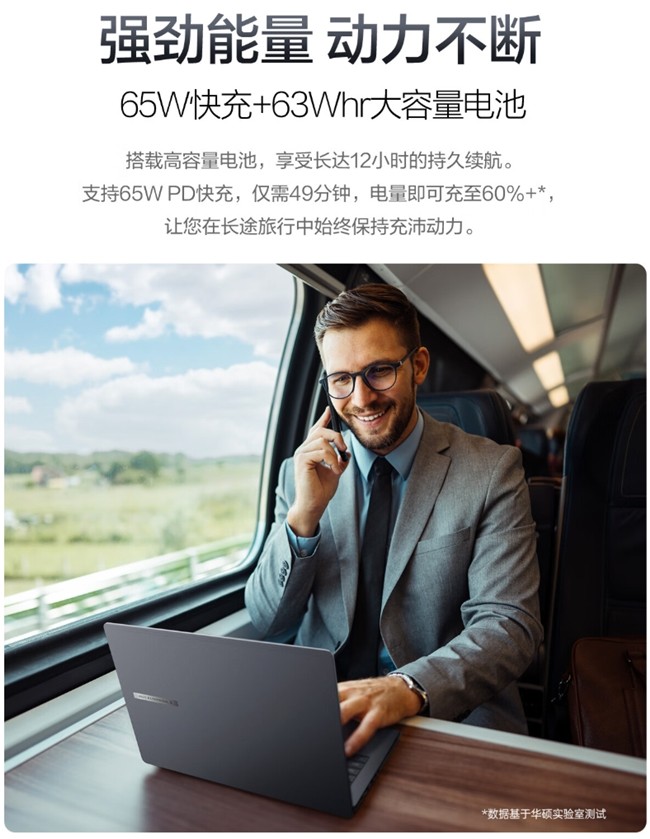 續(xù)航能力是移動(dòng)辦公的自由邊界。華碩破曉6S幻金版內(nèi)置63Whr大容量電池,可支持長(zhǎng)達(dá)12小時(shí)的持久續(xù)航,足以覆蓋一整天的辦公會(huì)議或長(zhǎng)途飛行辦公。配合65W PD快充技術(shù),電量告急時(shí)僅需49分鐘即可快速回血至60%以上,利用會(huì)議間歇或咖啡時(shí)間即可快速恢復(fù)戰(zhàn)力,讓電量焦慮成為過(guò)去式。