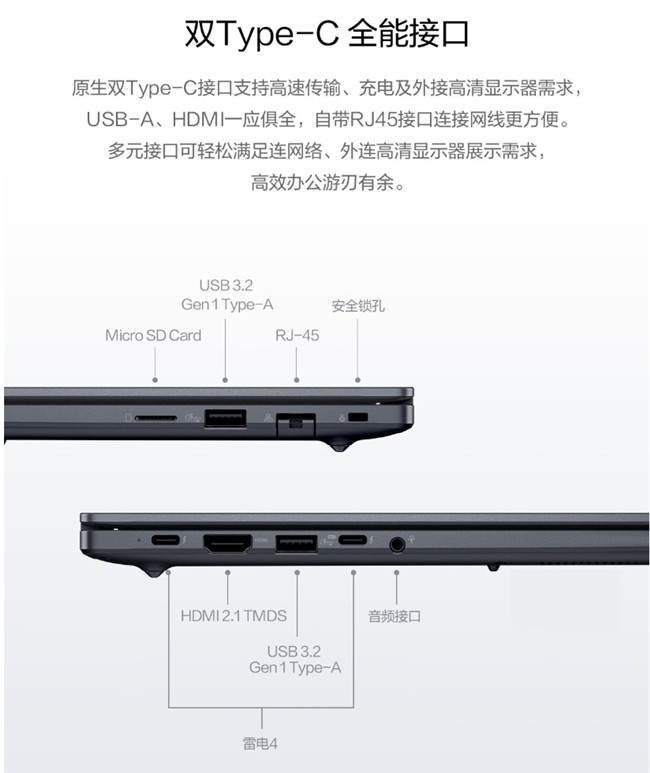 專(zhuān)業(yè)的商務(wù)辦公離不開(kāi)豐富的外設(shè)擴(kuò)展。破曉6S幻金版在接口配置上可謂“全能”,機(jī)身兩側(cè)集成了2個(gè)USB 3.2 Type-A、2個(gè)雷電4、1個(gè)HDMI 2.1視頻輸出、1個(gè)Micro SD卡槽以及1個(gè)RJ45以太網(wǎng)口。無(wú)需攜帶繁瑣的轉(zhuǎn)接器,即可輕松實(shí)現(xiàn)多屏協(xié)作、高速數(shù)據(jù)傳輸、外接投影等多種需求,助力用戶(hù)打造個(gè)人高效協(xié)作工作中心。