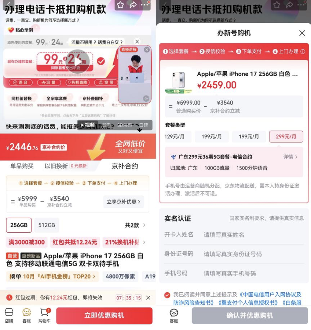廣東消費者購買iPhone 17 256GB,可選擇當(dāng)?shù)仉娦?99元36期5G套餐,享京補合約補貼立減3540元,到手價2459元,套餐含每月100GB流量和1500分鐘語音。北京消費者可辦理當(dāng)?shù)仉娦?99元36期5G套餐,可享京補合約補貼立減2950元,iPhone 16 128GB到手價1949元,iPhone 16 Plus 256GB到手價4049元,iPhone 16e 256GB到手價2449元,套餐含每月180GB流量和2200分鐘語音。
