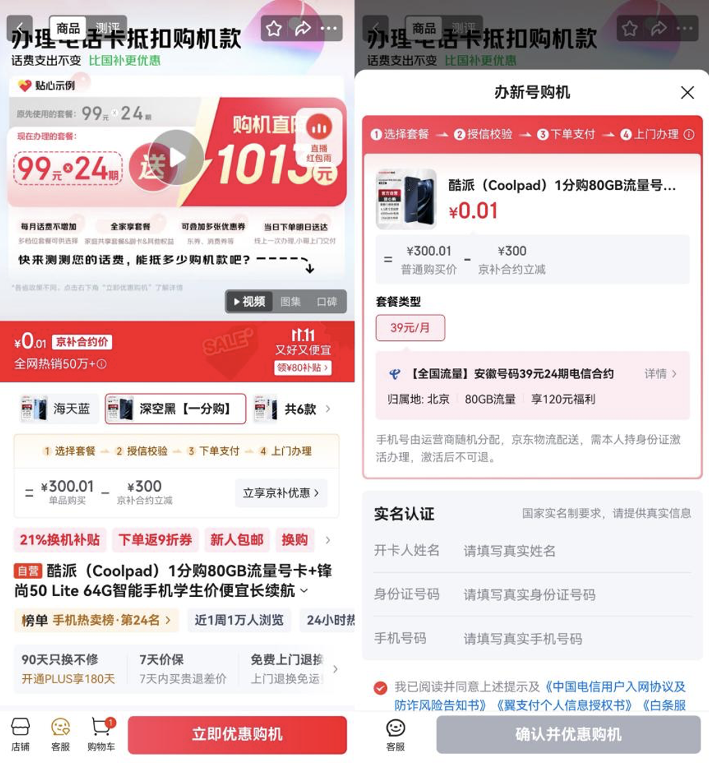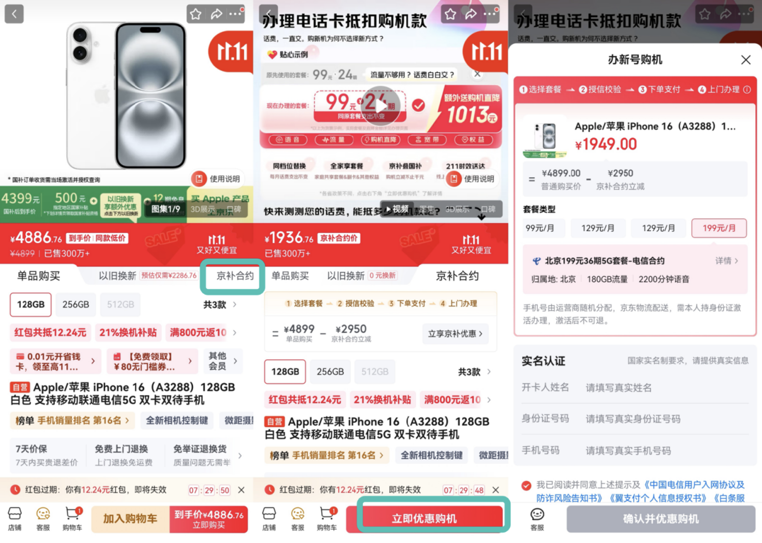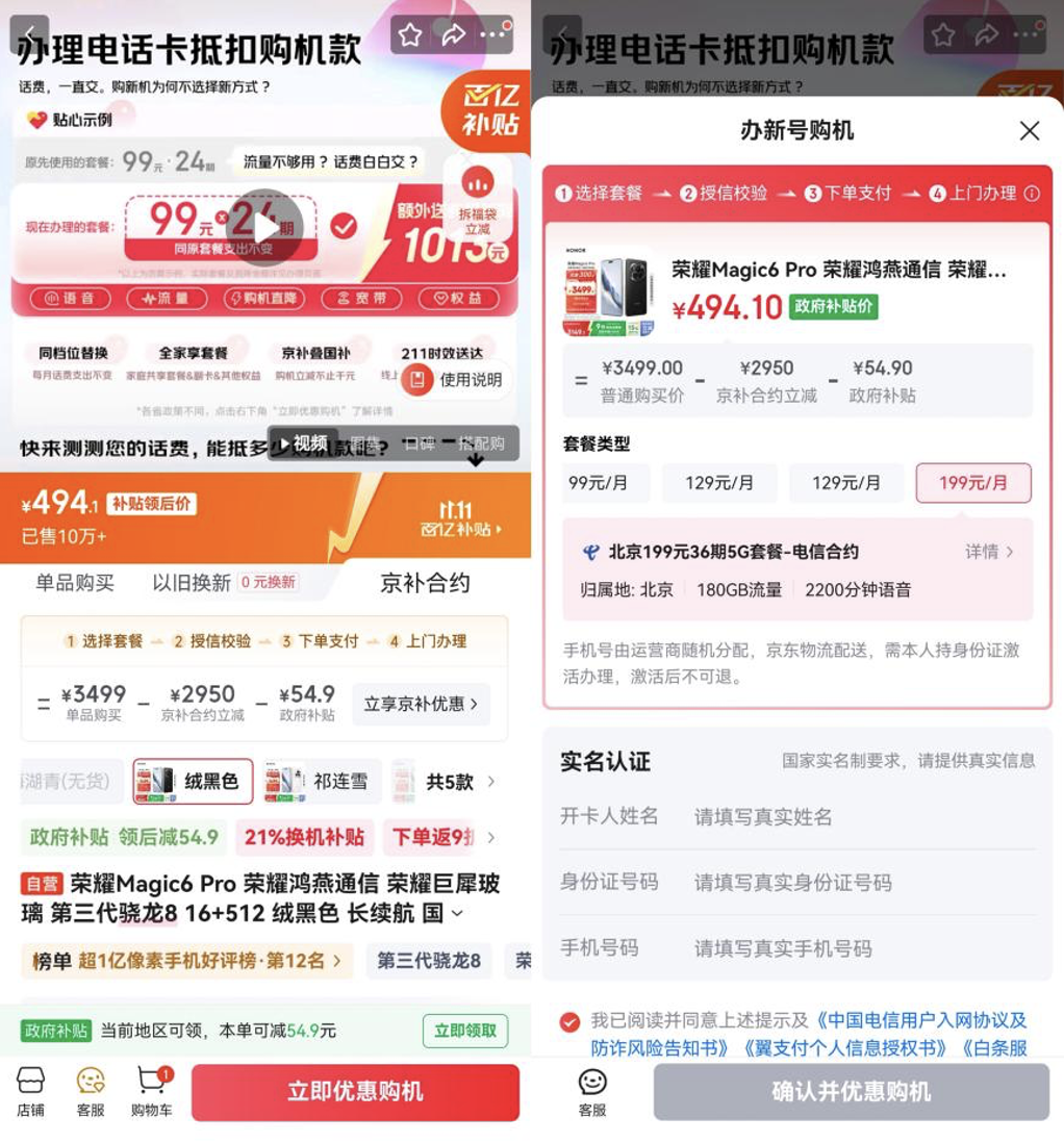 消費者到京東APP搜索想要購買的手機產(chǎn)品,選擇京東自營商品,點擊商品圖下方的“京補合約”,然后點擊“立即優(yōu)惠購機”,就可以選擇話費套餐,輸入身份信息,勾選辦理協(xié)議,隨后下單就能享受補貼了。線上點幾下完成下單后,京東快遞小哥將上門協(xié)助消費者完成信息核驗和套餐激活等流程,一站式搞定新手機、新號卡、新套餐,足不出戶就能省錢購機。