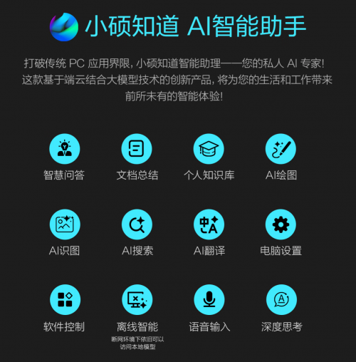 身處AI時代,華碩無畏Pro16 2025內(nèi)置“小碩知道”AI智能助手,成為你工作提效的秘密武器。它支持智慧問答、文檔總結(jié)、AI繪圖、AI識圖、AI搜索、AI翻譯等多個功能,日常寫文案、整理資料時,可以幫你找靈感、生成初稿或提煉核心信息,AI識圖與翻譯功能則適配跨語言辦公、圖片信息提取場景,大幅提升日常效率。更實用的是,“小碩知道”基于端云一體AI大模型,無網(wǎng)絡環(huán)境下也能繼續(xù)使用,避免在飛機高鐵、戶外等場景中因信號問題中斷效率。