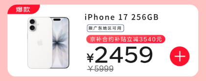 以最新款256GB版本的iPhone 17為例,官方售價(jià)5999元,京東11.11期間,廣東地區(qū)用戶(hù)通過(guò)京補(bǔ)合約下單,可享京補(bǔ)合約補(bǔ)貼立減3540元,最終到手價(jià)僅需2459元。